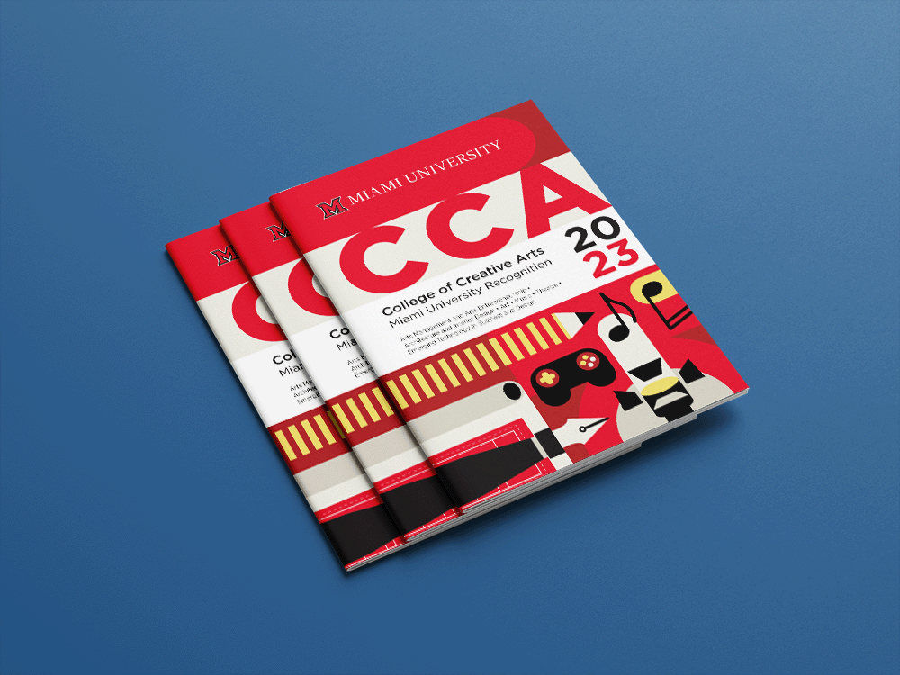 I was given the opportunity to design the commencement covers for Miami University's graduating class of 2023 in the following divisions: The College of Creative Arts, the College of Education, Health, and Society, and the College of Arts and Sciences. I chose to design a flat graphic-style cover for these three divisions. This allowed me to play with the flow of the icons on each cover that represent their majors. Using a limited color palette, I created icons representing each of the majors from each division and arranged them to create visual flow and color contrast. I utilized the back cover to design a visually interesting and fluid design to continue the geometric and organic flow depicted on the front. This was a project I greatly enjoyed working on, and it was very well received by the various departments that approved it.